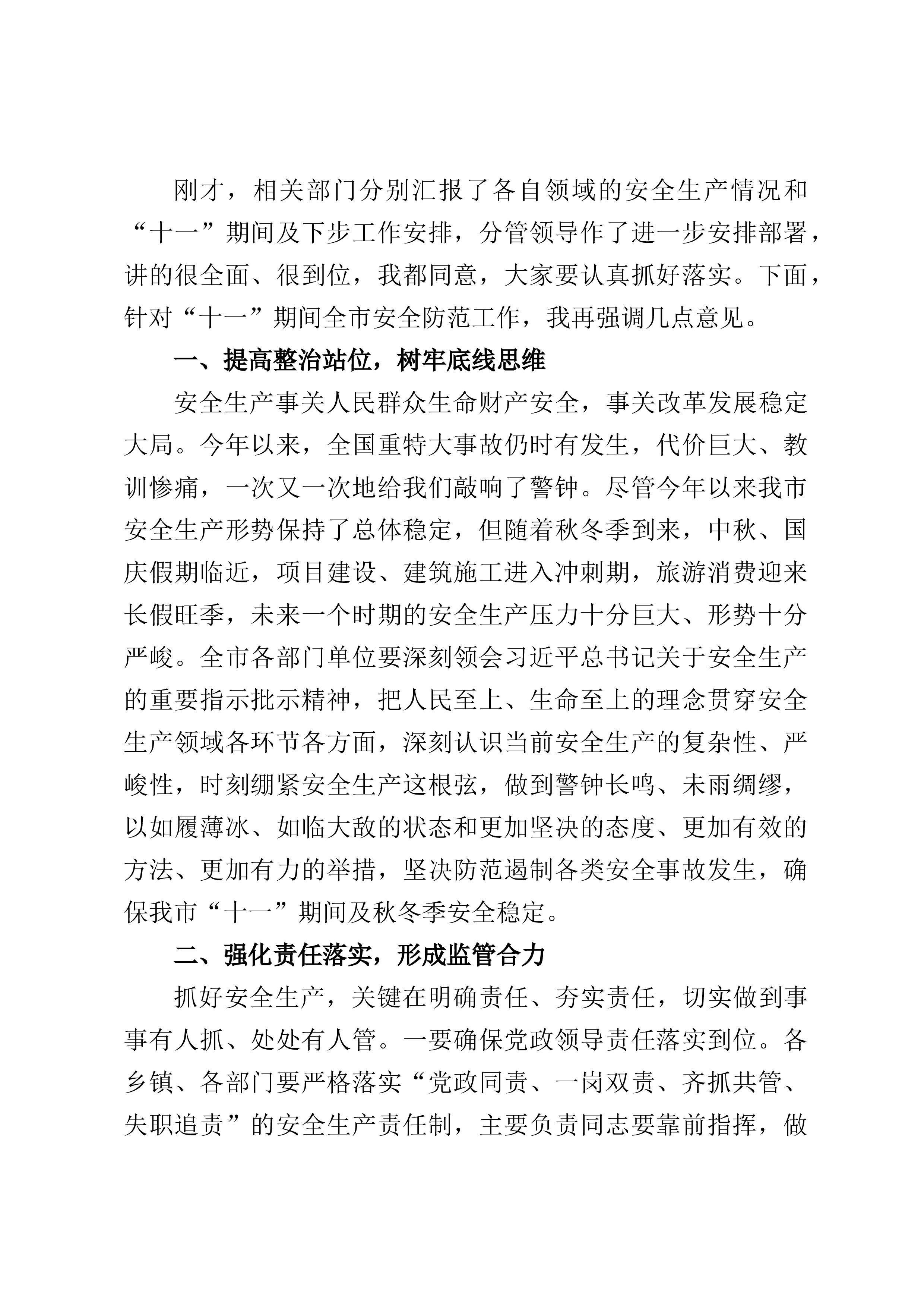 刚才,相关部门分别汇报了各自领域的安全生产情况和“十一”期间及下步工作安排,分管领导作了进一步安排部署,讲的很全面、很到位,我都同意,大家要认真抓好落实。下面,针对“十一”期间全市安全防范工作,我再强调几点意见。一、提高整治站位,树牢底线思维安全生产事关人民群众生命财产安全,事关改革发展稳定大局。今年以来,全国重特大事故仍时有发生,代价巨大、教训惨痛,一次又一次地给我们敲响了警钟。尽管今年以来我市安全生产形势保持了总体稳定,但随着秋冬季到来,