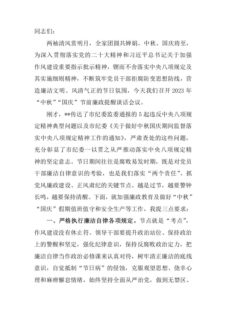 、国庆“双节”节前集体廉政谈话提纲廉政,国庆,2023,