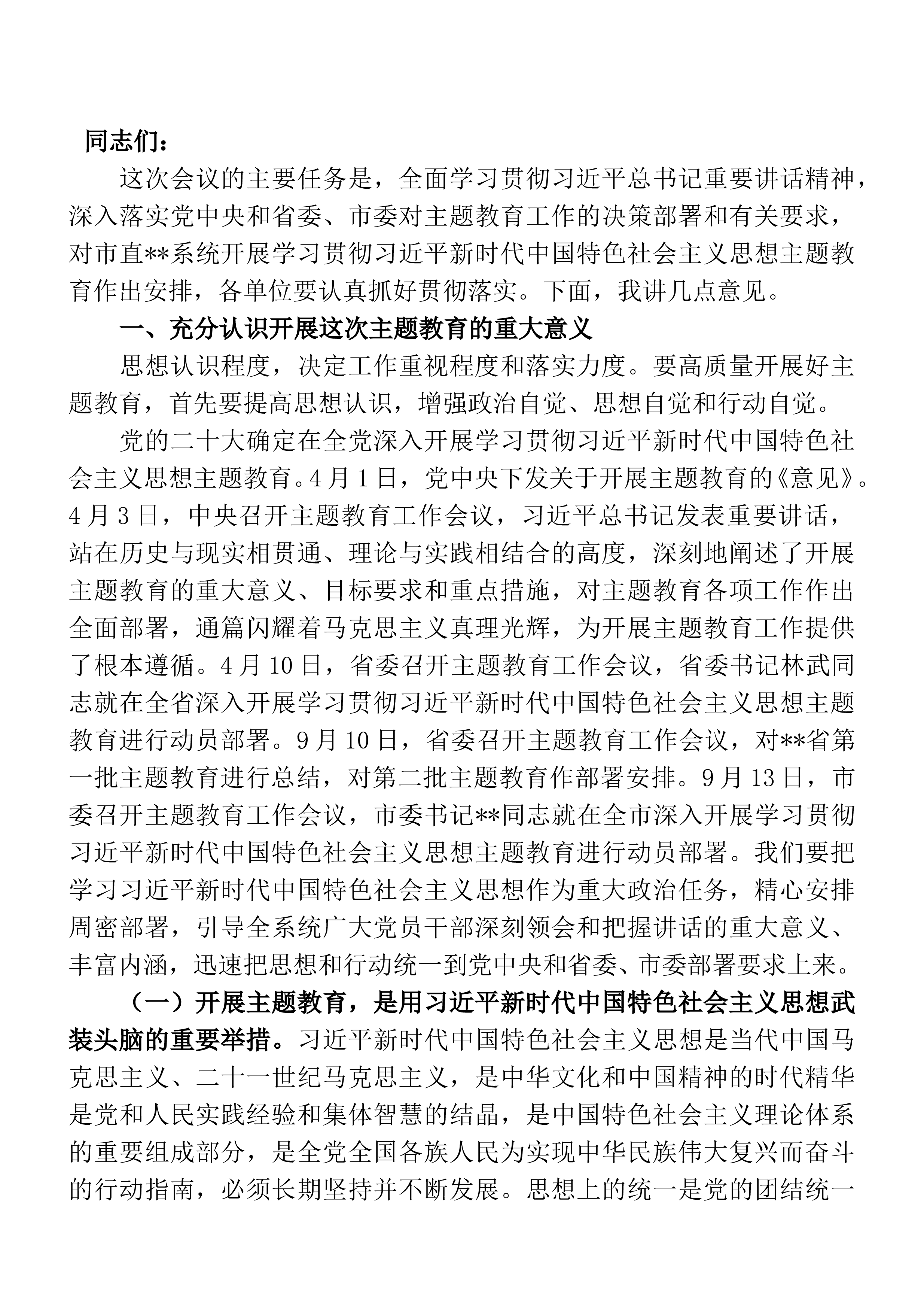 同志们:今天会议的主要目的是贯彻落实全市全国文明城市创建工作动员大会暨文明城市创建工作推进会议精神,对全局参与创建工作进行再部署、再动员。刚才传达了全市创城工作推进会精神,下面,我代表局党组讲三个方面意见。一、提高认识,坚定“创城”必须“创成”的信心全局干部职工要深入学习XX书记重要讲话精神,始终保持“永远在路上”的精神状态和“每天都是创建日”的奋斗姿态,深刻认识创城的必要性和紧迫性。要深刻认识创建文明城市是大势所趋。文明城市是一个城市的最高荣誉,是反映城市综合实力和整体文明水平的重要标尺。近年来,随着城市的竞争日益激烈,创建文明城市已经成为各地提升竞争力的重要目标。我省的XX市、XX市等已成...