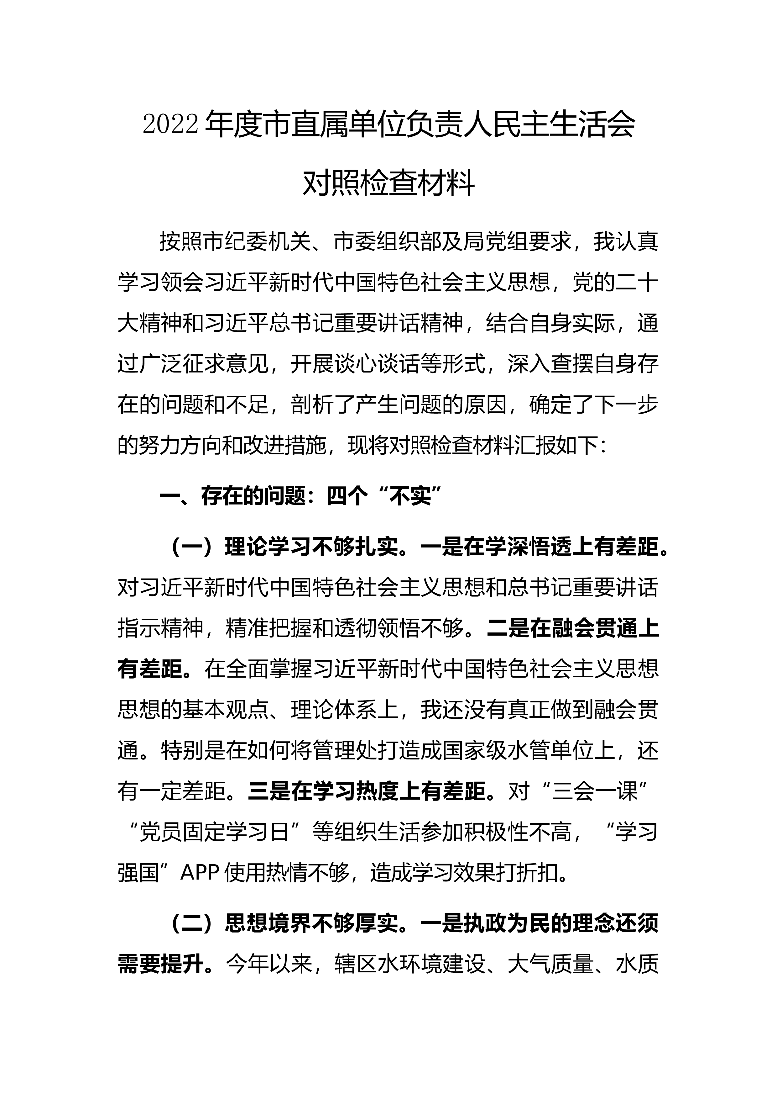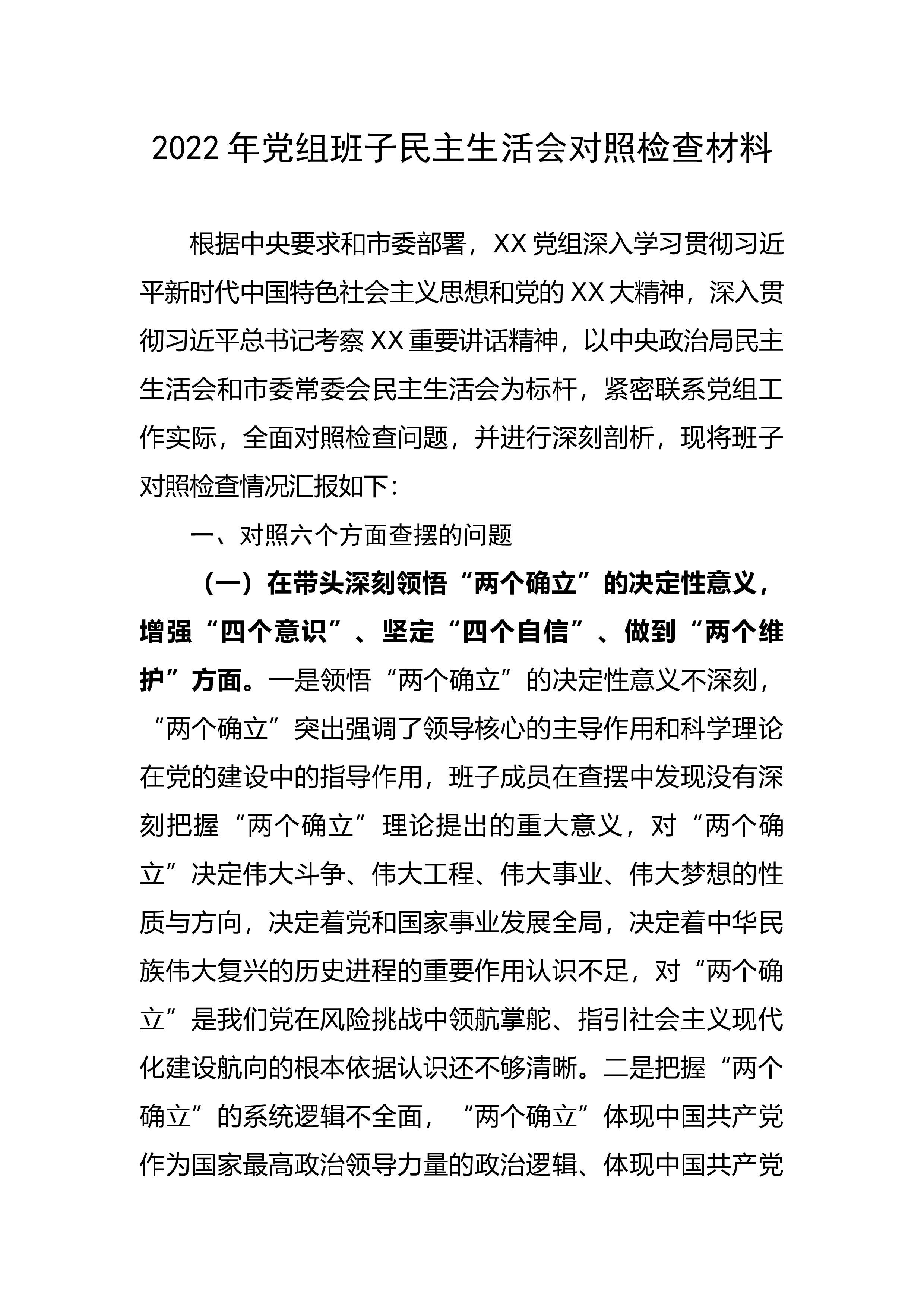 2022年度党员领导干部“六个带头”民主生活会个人对照检查材料按照《关于开好2022年度党和国家机关党员领导干部民主生活会的通知》要求,会前,本人采取集中学习、交流探讨、个人自学、撰写学习心得等形式,认真学习学习习近平总书记在中央政治局民主生活会上的重要讲话精神党的XX大精神等内容,提升了党性修养,为开好本次民主生活会打好了坚实基础。同时与党员、与班子成员进行了谈心谈话,听取了改进工作的意见和建议,并对照“六个带头”,认真查摆了存在的问题、剖析了产生的原因、明确了努力方向。现将个人对照检查情况报告如下。一、查摆的问题(一)在带头深刻领悟“两个确立”的决定性意义,增强“四个意识”、坚定“四个自信...