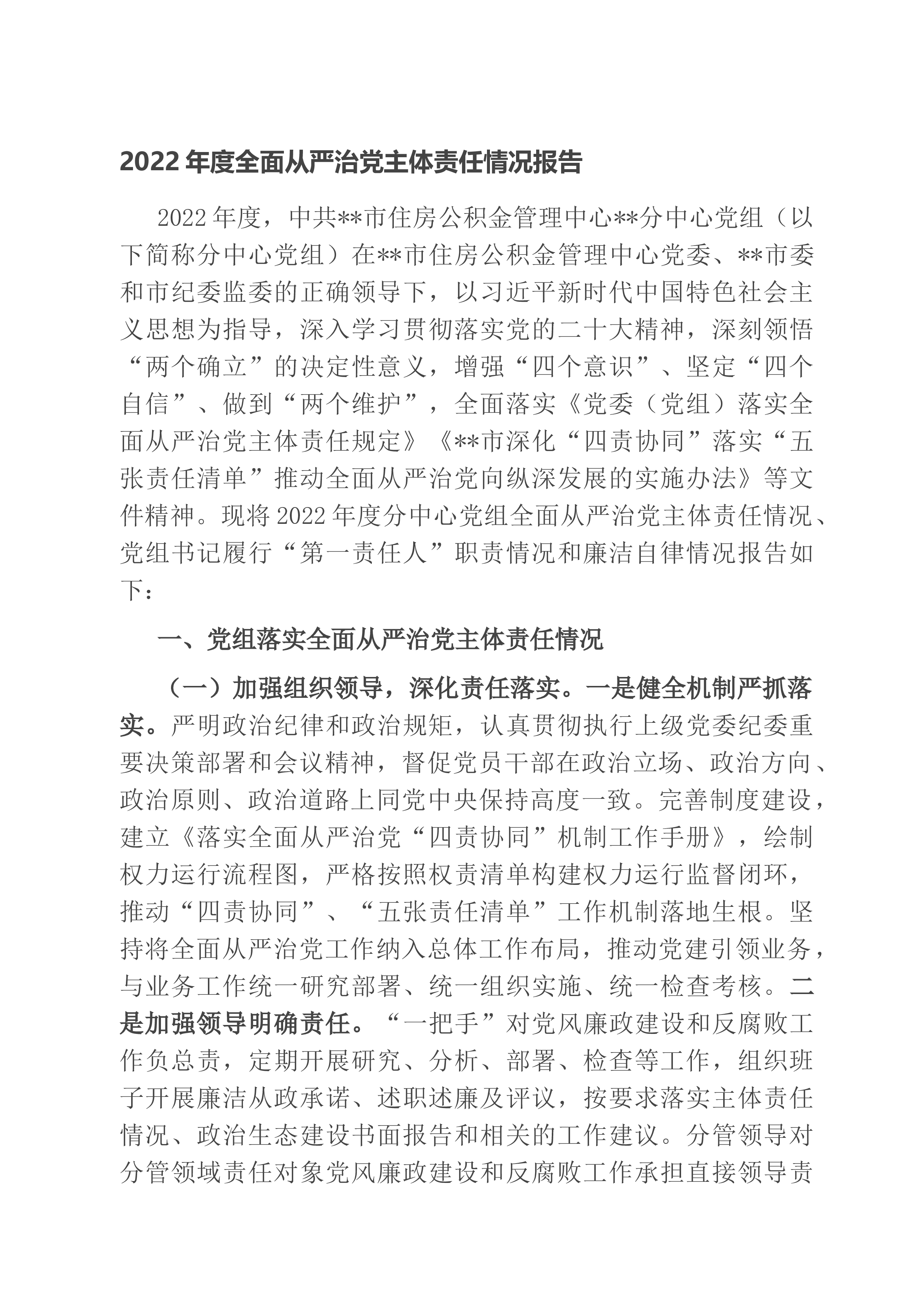 区委2022年落实全面从严治党主体责任情况报告