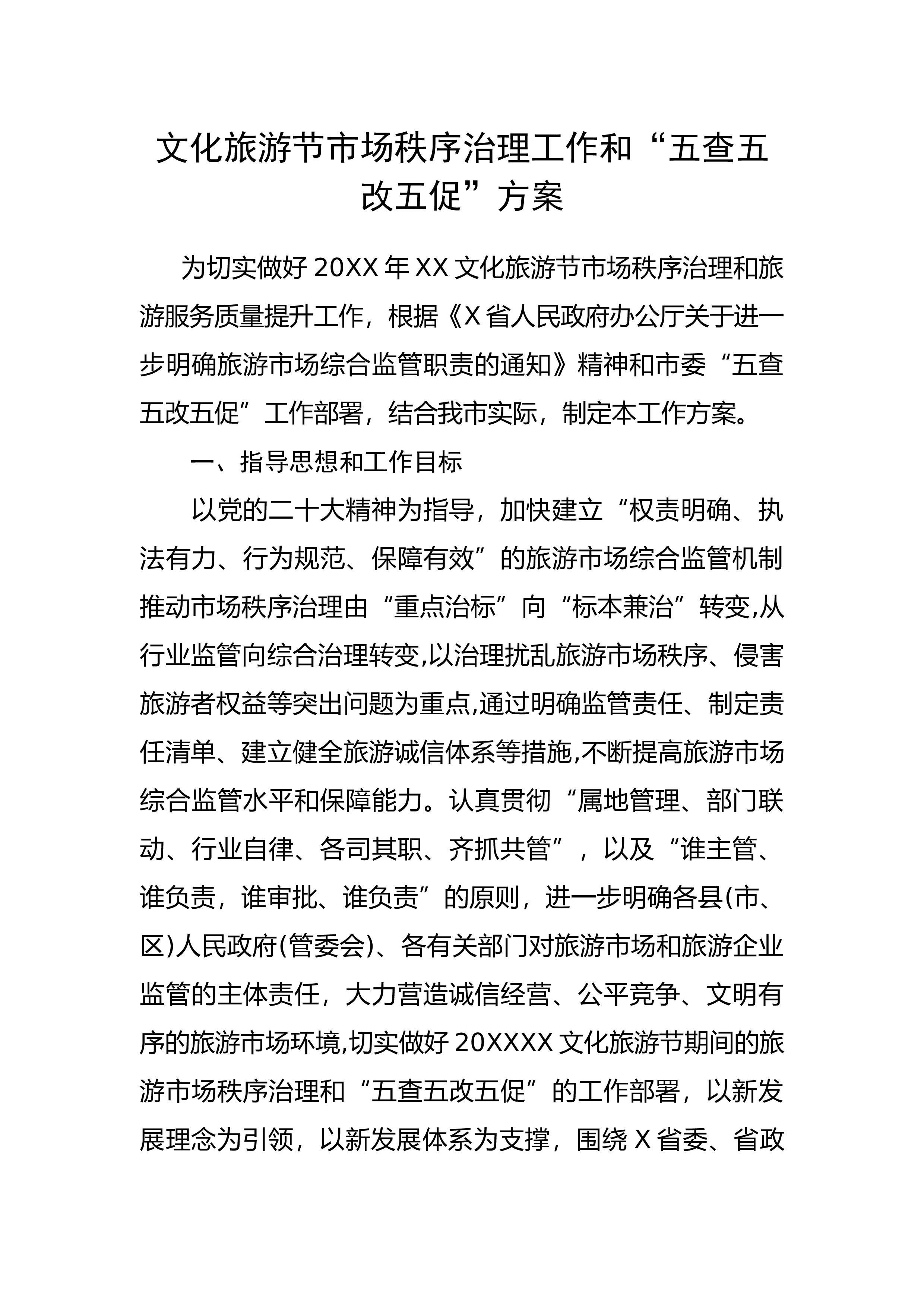 文化旅游节市场秩序治理工作和“五查五改五促”方案 为切实做好20XX年XX文化旅游节市场秩序治理和旅游服务质量提升工作,根据《X省人民政府办公厅关于进一步明确旅游市场综合监管职责的通知》精神和市委“五查五改五促”工作部署,结合我市实际,制定本工作方案。 一、指导思想和工作目标 以党的二十大精神为指导,加快建立“权责明确、执法有力、行为规范、保障有效”的旅游市场综合监管机制推动市场秩序治理由“重点治标”向“标本兼治”转变,从行业监管向综合治理转变,以治理扰乱旅游市场秩序、侵害旅游者权益等突出问题为重点,通过明确监管责任、制定责任清单、建立健全旅游诚信体系等措施,不断提高旅游市场综合监管水平...