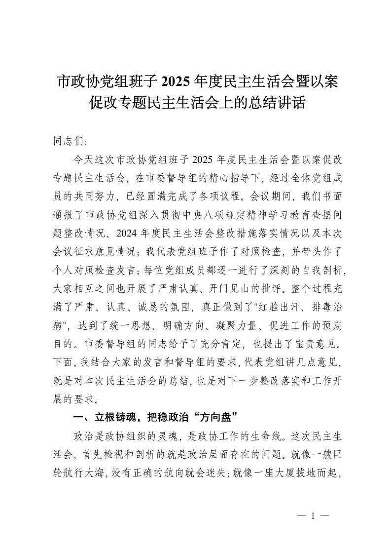 ,讲话,党组,生活市政协党组班子2025年度民主生活会民主生活会上的