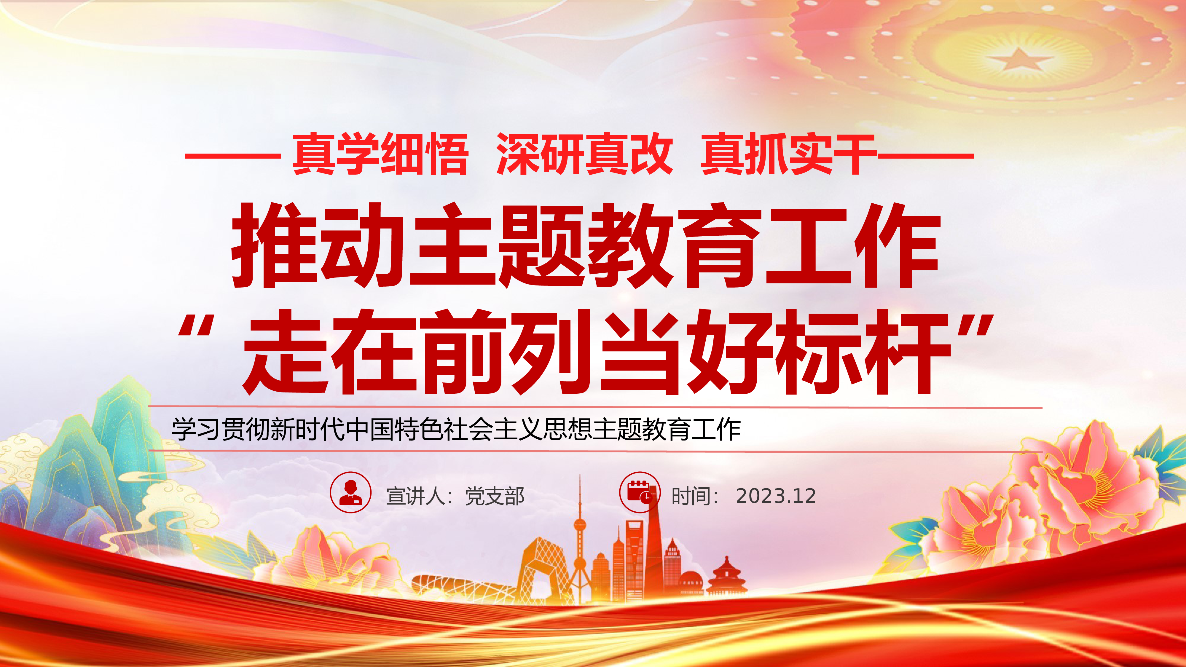 宣讲人:党支部时间:2023.12推动党课教育工作“走在前列当好标杆”——真学细悟深研真改真抓实干——学习贯彻新时代中国特色社会主义思想党课教育工作目录CONTENTS坚持人民至上,践行群众路线1坚持自信自立,坚定不移走自己的路2坚持守正创新,以新的理论指导新的实践3真学细悟,把学思想成效体现在“强党性”上1深研真改,把学思想成效体现在“重实践”上2真抓实干,把学思想成效体现在“建新功”上3第一部分真学细悟,把学思想成效体现在“强党性”上真学细悟,把学思想成效体现在“强党性”上坚持把学习贯彻领导人新时代中国特色社会主义思想作为主线贯穿始终,运用“五学联动”“联学共建”机制抓实...