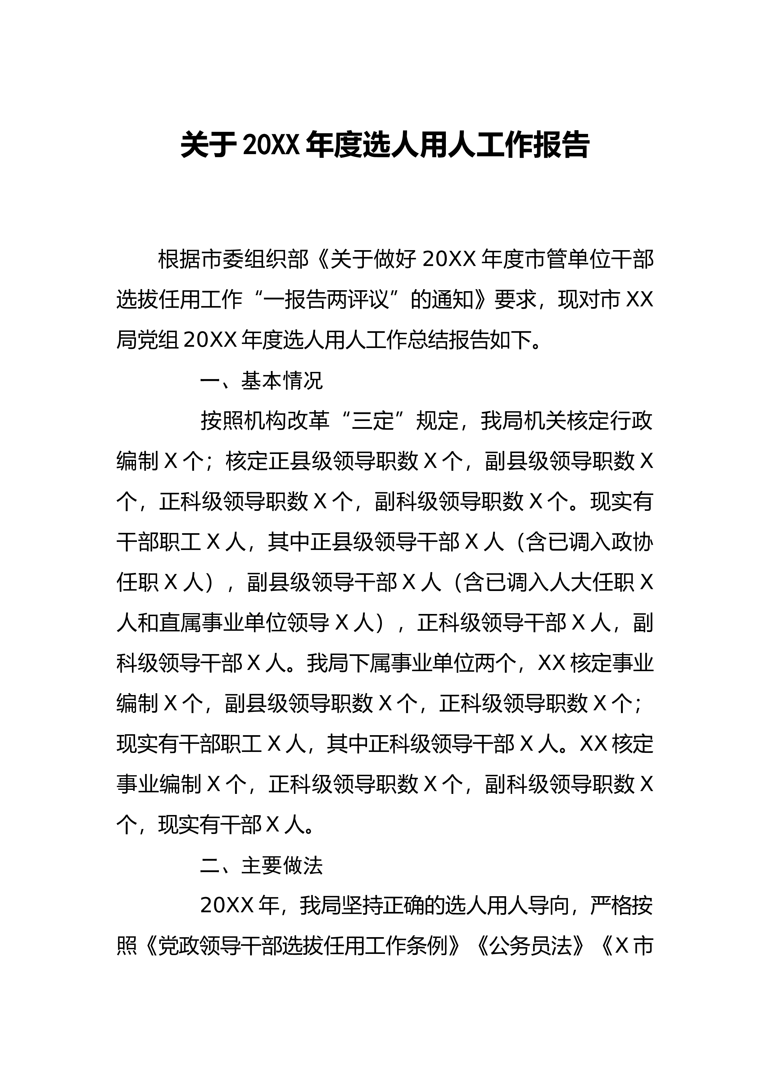 关于20XX年度选人用人工作报告根据市委组织部《关于做好20XX年度市管单位干部选拔任用工作“一报告两评议”的通知》要求,现对市XX局党组20XX年度选人用人工作