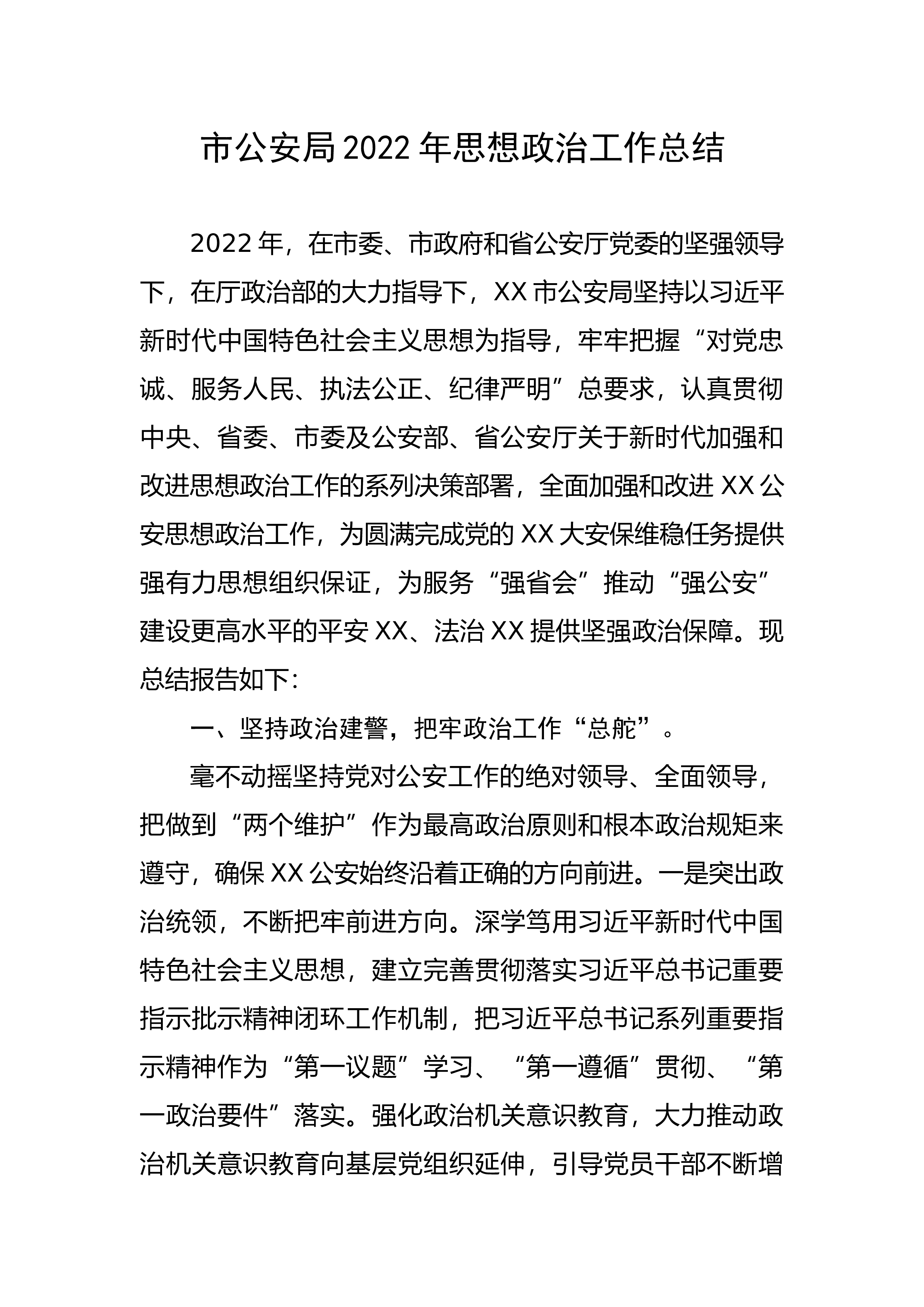 市公安局2022年思想政治工作总结2022年,在市委、市政府和省公安厅党委的坚强领导下,在厅政治部的大力指导下,XX市公安局坚持以习近平新时代中国特色社会主义思想为指导,牢牢把握“对党忠诚、服务人民、执法公正、纪律严明”总要求,认真贯彻中央、省委、市委及公安部、省公安厅关于新时代加强和改进思想政治工作的系列决策部署,全面加强和改进XX公安思想政治工作,为圆满完成党的XX大安保维稳任务提供强有力思想组织保证,为服务“强省会”推动“强公安”建设更高水平的平安XX、法治XX提供坚强政治保障。现总结报告如下:一、坚持政治建警,把牢政治工作“总舵”。毫不动摇坚持党对公安工作的绝对领导、全面领导,把做到“...