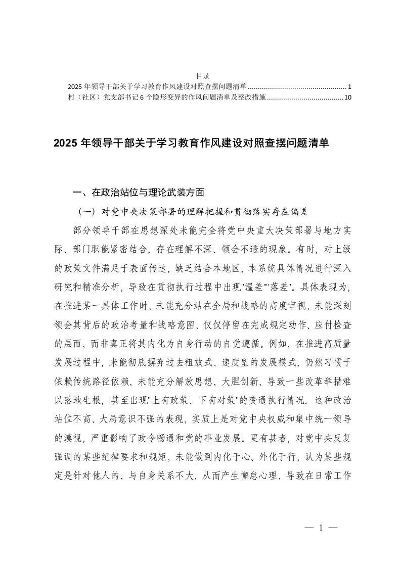 2025年领导干部关于学习教育作风建设对照查摆问题清单党支部书记6个隐形变异的作风问题清单及整改措施