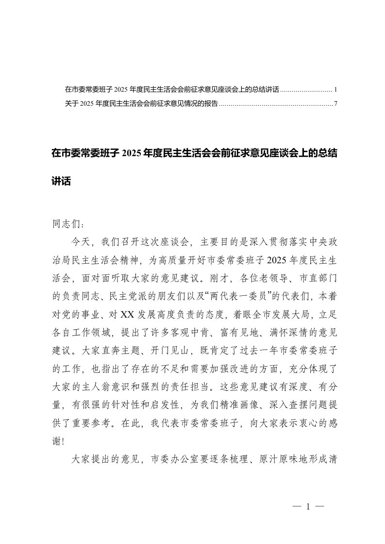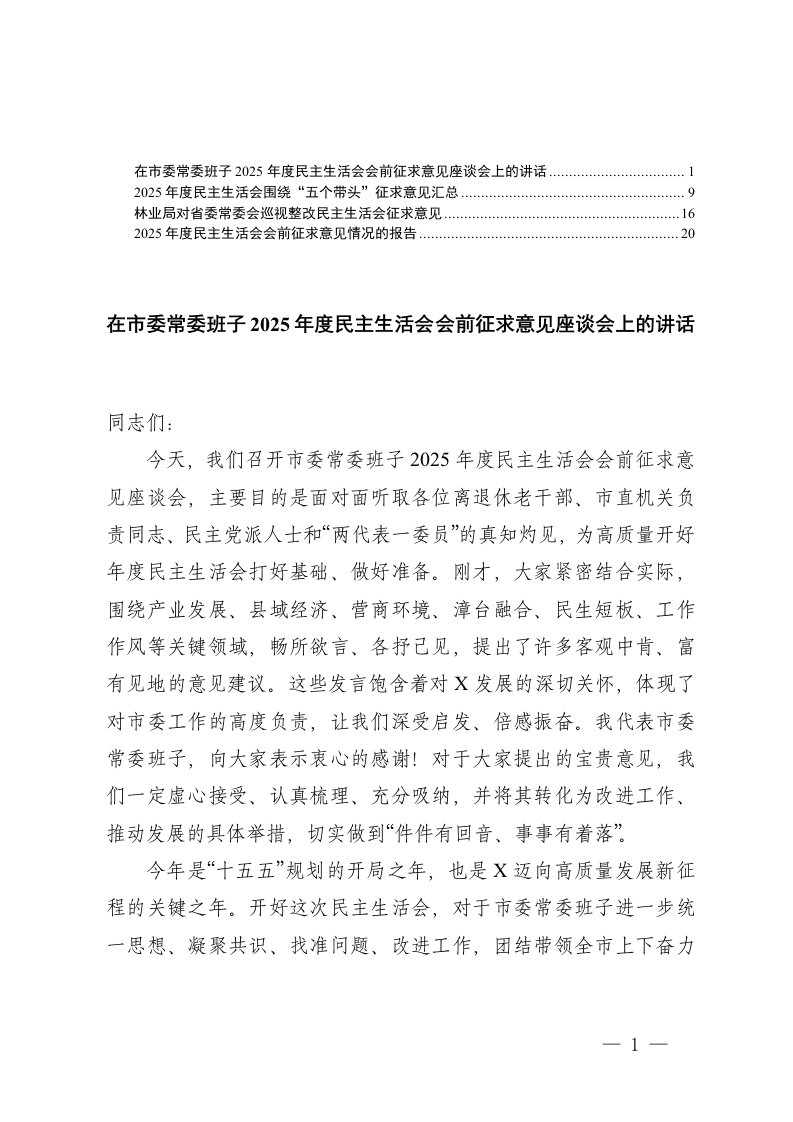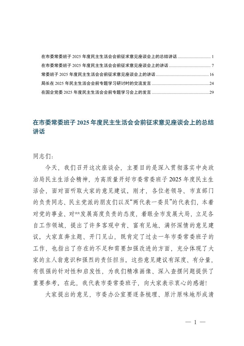 在市委常委班子2025年度民主生活会会前征求意见座谈会上的总结讲话民主生活会会前专题学习会上的发言
