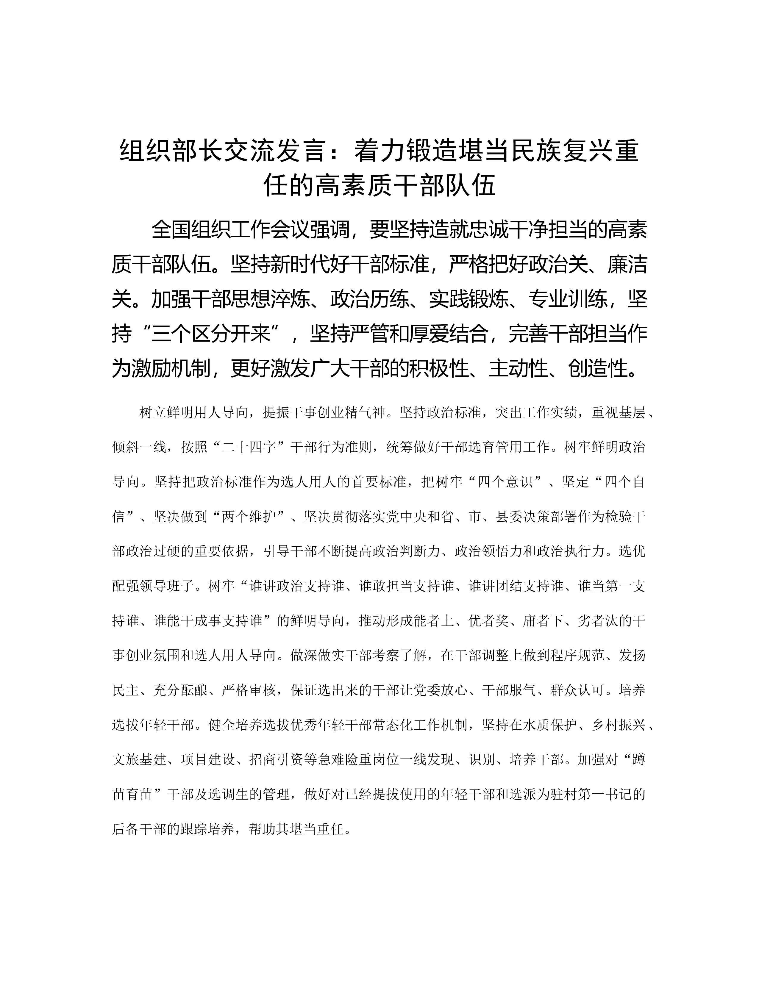 组织部长在县委理论学习中心组专题研讨交流会上的发言党的二十大报告首次用“六个坚持”深刻阐述了习近平新时代中国特色社会主义思想的世界观和方法论,是新时代中国共产党人理论创造、实践探索、政治品格的集中体现,是我们理解把握党的创新理论的“金钥匙”。做好新时代组织工作必须深刻领会、全面把握、灵活运用这一科学的世界观和方法论,将其作为根本指引和重要遵循,确保各项工作取得新进展新成效,以高质量组织工作服务保障高质量发展。一、坚持守正创新,在严密组织体系中发挥政治优势组织严密是党的光荣传统和独特优势。要着力构建上下贯通、执行有力的严密组织体系,切实把党的政治优势和组织优势巩固好、发展好。一是抓根本,加强政治...