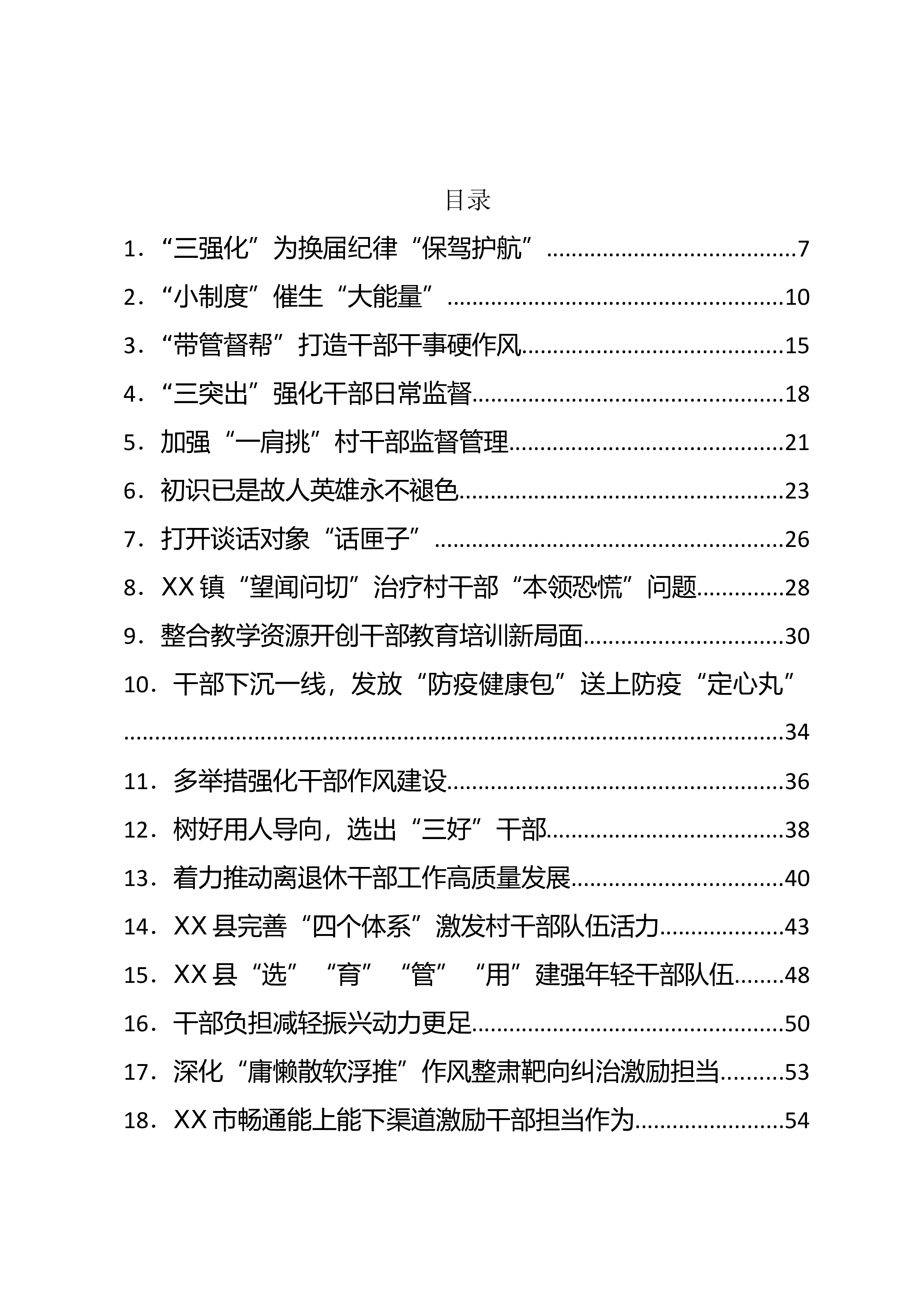 目录1.“三强化”为换届纪律“保驾护航”........................................72.“小制度”催生“大能量”......................................................103.“带管督帮”打造干部干事硬作风..........................................154.“三突出”强化干部日常监督..................................................185.加强“一肩挑”村干部监督管理............................