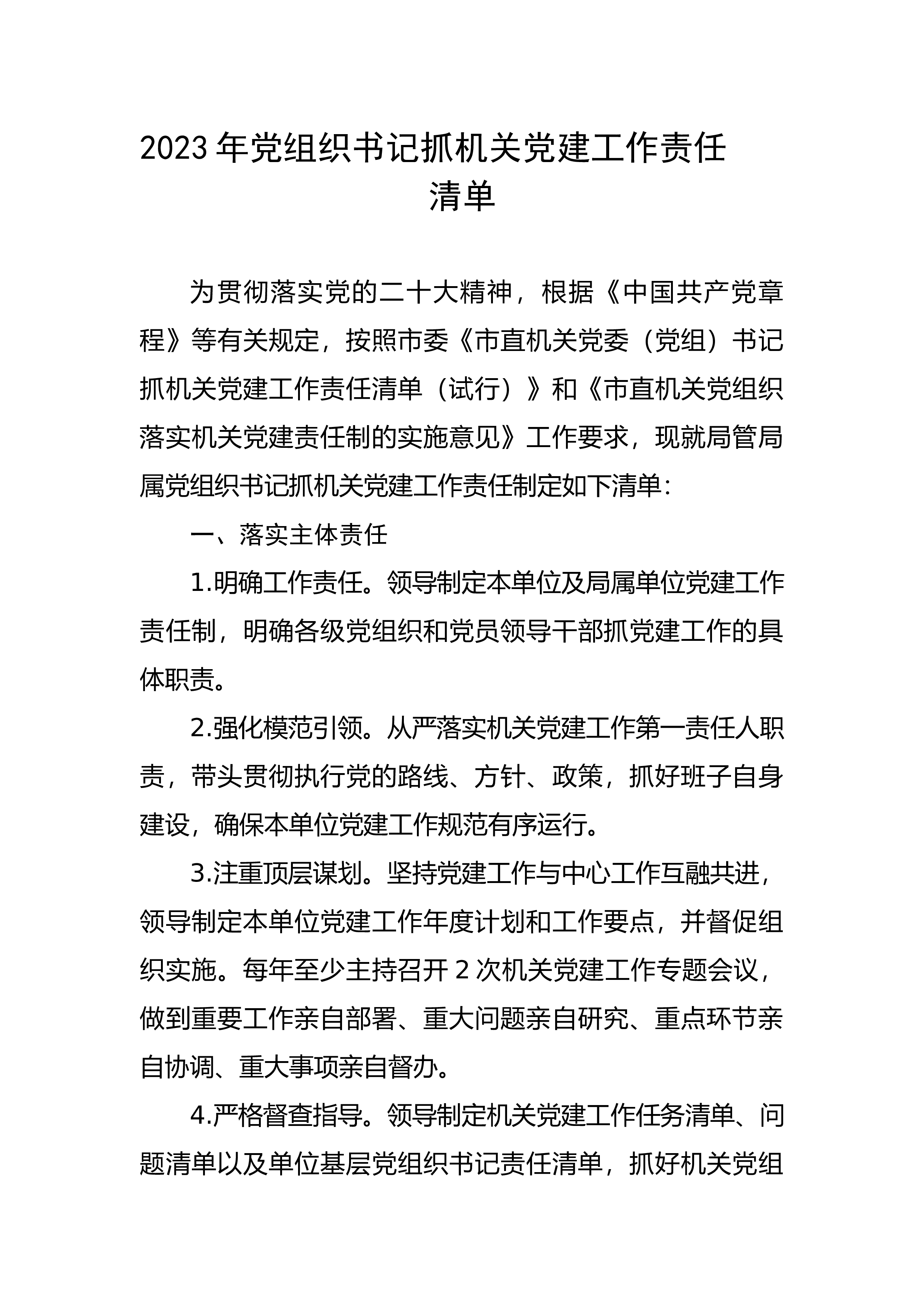 【组织党建】2023年党组织书记抓机关党建工作责任清单