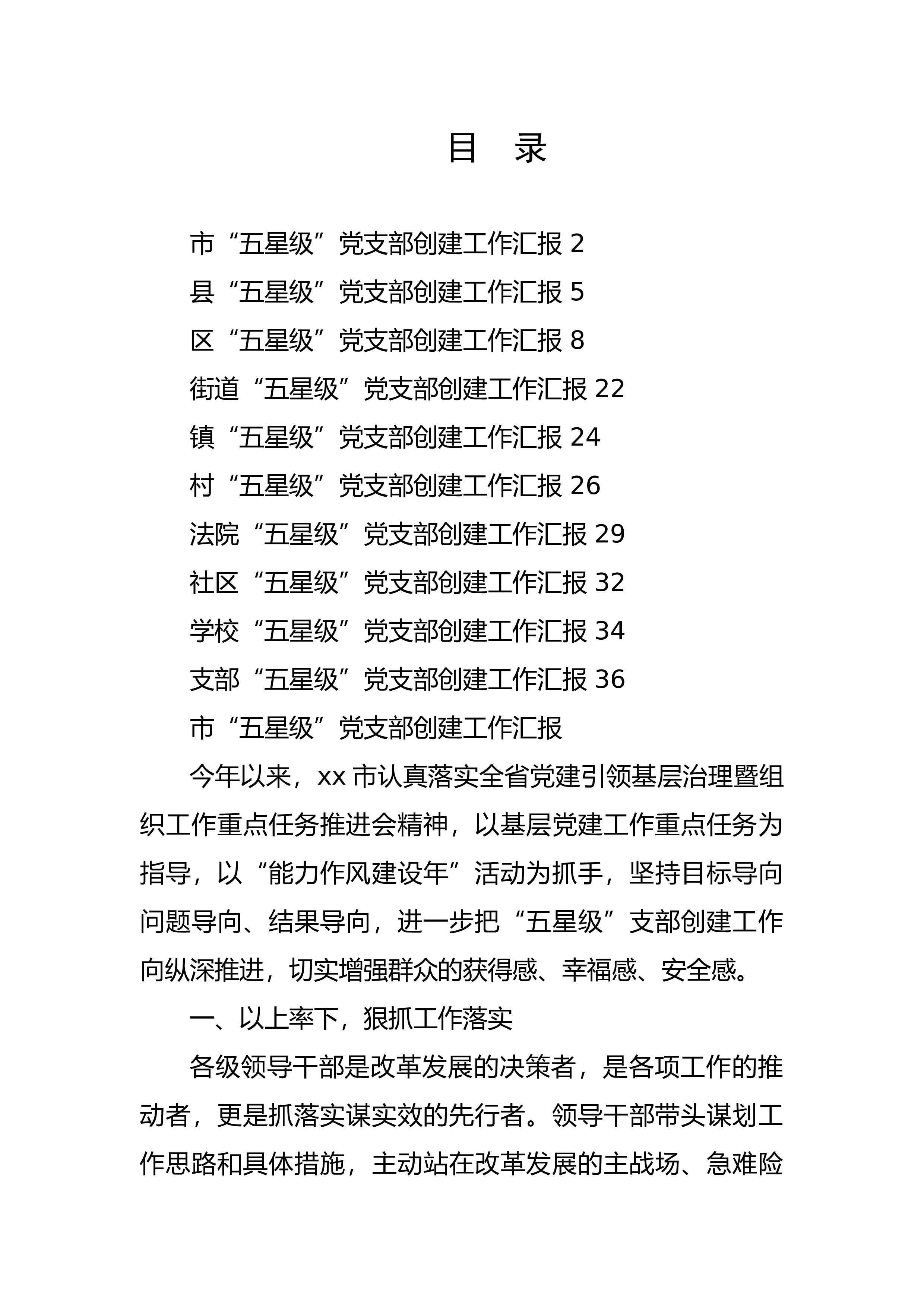 目录市“五星级”党支部创建工作汇报2县“五星级”党支部创建工作汇报5区“五星级”党支部创建工作汇报8街道“五星级”党支部创建工作汇报22镇“五星级”党支部创建工作汇报24村“五星级”党支部创建工作汇报26法院“五星级”党支部创建工作汇报29社区“五星级”党支部创建工作汇报32学校“五星级”党支部创建工作汇报34支部“五星级”党支部创建工作汇报36市“五星级”党支部创建工作汇报今年以来,xx市认真落实全省党建引领基层治理暨组织工作重点任务推进会精神,以基层党建工作重点任务为指导,以“能力作风建设年”活动为抓手,坚持目标导向问题导向、结果导向,进一步把“五星级”支部创建工作向纵...